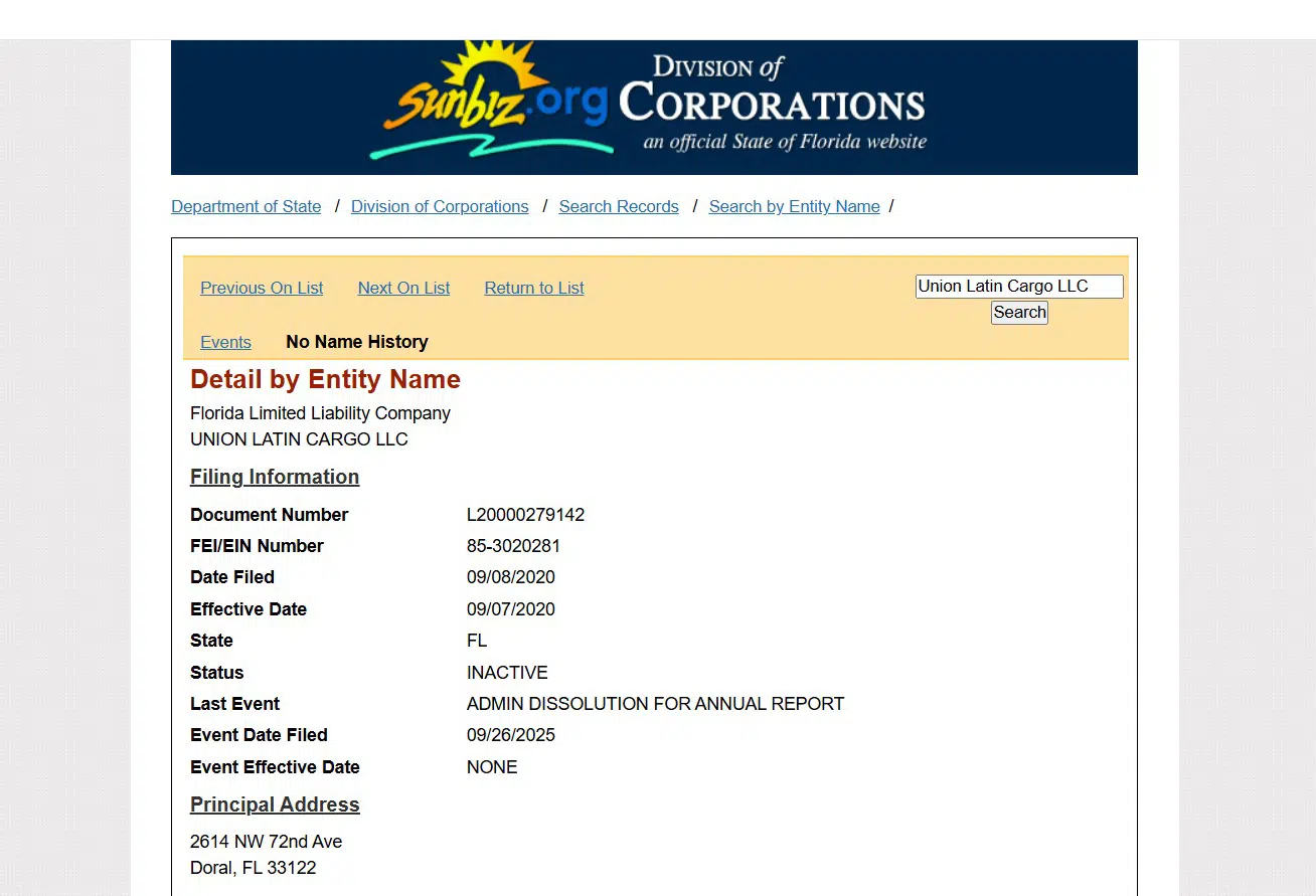 Una revisión de documentos del registro mercantil del estado de Florida, Estados Unidos revela que el 9 de agosto de 2020 se creó una filial denominada Union Latin Cargo LLC, con los mismos socios que la empresa hondureña.