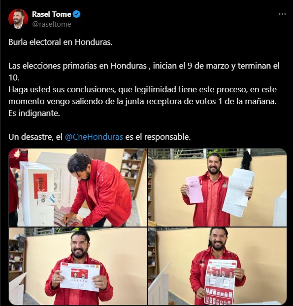 Según denunció en su cuenta de X, salió de la votación hasta la 1 de la madrugada de hoy, debido a que la urna donde debía votar permaneció cerrada durante todo el día, problema que se repitió en varios centros educativos del país, lo que llevó a Tomé a cuestionar la legitimidad del proceso electoral.