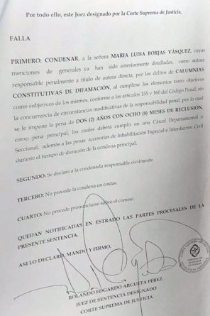 Noticia Relacionada: Por calumnias declaran culpable a María Luisa Borjas