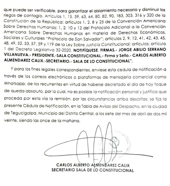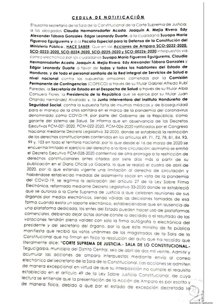 Tegucigalpa.- La Sala de lo Constitucional de la Corte Suprema de justicia de Honduras admitió el recurso de amparo presentado por el Colegio Mèdico de Honduras y los abogados Claudia Hermannsdofer, Ana Pineda, Edy Tabora, Joaquín Mejía Rivera y Edgar Leonardy Duarte.