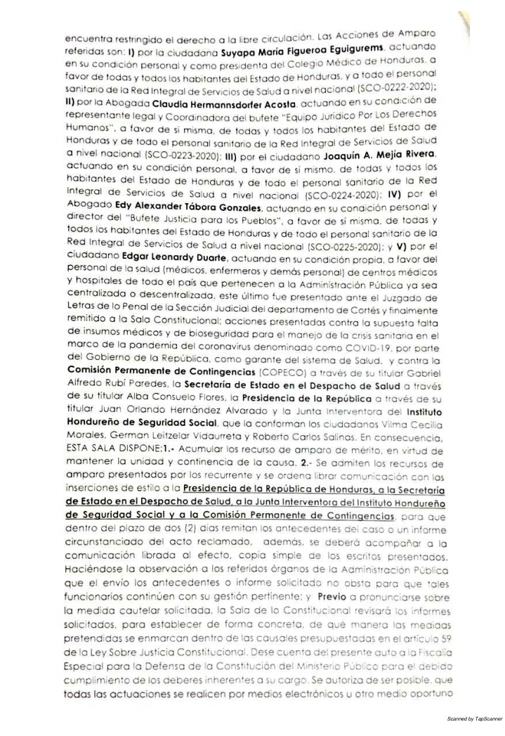 En ese sentido la sala también ha acumulado varios recursos porque han sido alrededor de cinco o mas recursos presentados también por Suyapa Figueroa a nombre del Colegio Medico y juntarlos todos le ha dado un plazo de dos días al Poder Ejecutivo, a la Secretaría de Salud, Copeco y a la Junta Interventora del Seguro Social para que envíen a la sala un informe sobre los hechos que los recurrentes estan reclamando.