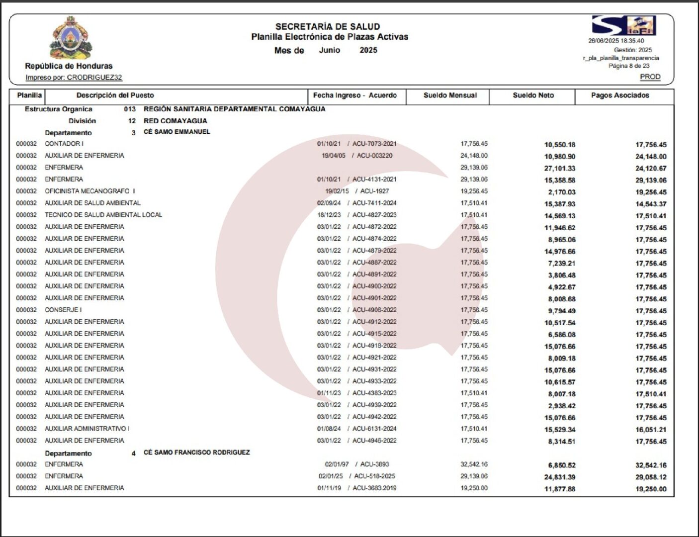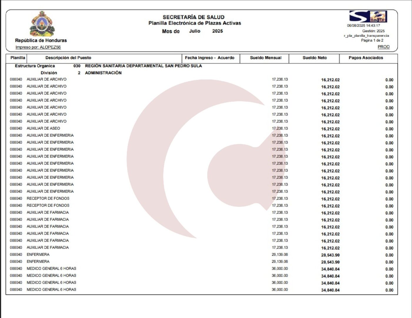 El Mirón [la sección de verificación de Criterio.hn] revisó las planillas de pago del personal permanente y personal por contrato de la Secretaría de Salud, publicadas en el portal único de Transparencia del Instituto de Acceso a la Información Pública para corroborar los pagos salariales a los y las enfermeras auxiliares, encontrando que estos oscilan entre L17,510.41 y L. 21,200.