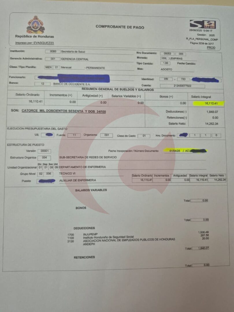 Orellana compartió un voucher de pago de una enfermera en donde se refleja el pago de 16,110 y además detalló que los montos superiores, como 23,000 o hasta 26,000 lempiras mensuales –que se reflejan en la planilla de salario de la Sesal— solo se logran tras más de dos décadas de servicio, sumando quinquenios, pequeños ajustes anuales y bonificaciones específicas, pero de ninguna manera representan el promedio del gremio.