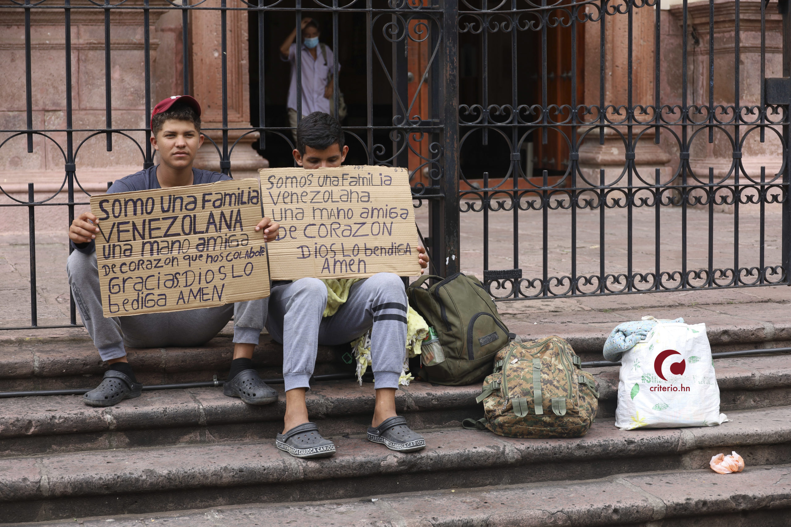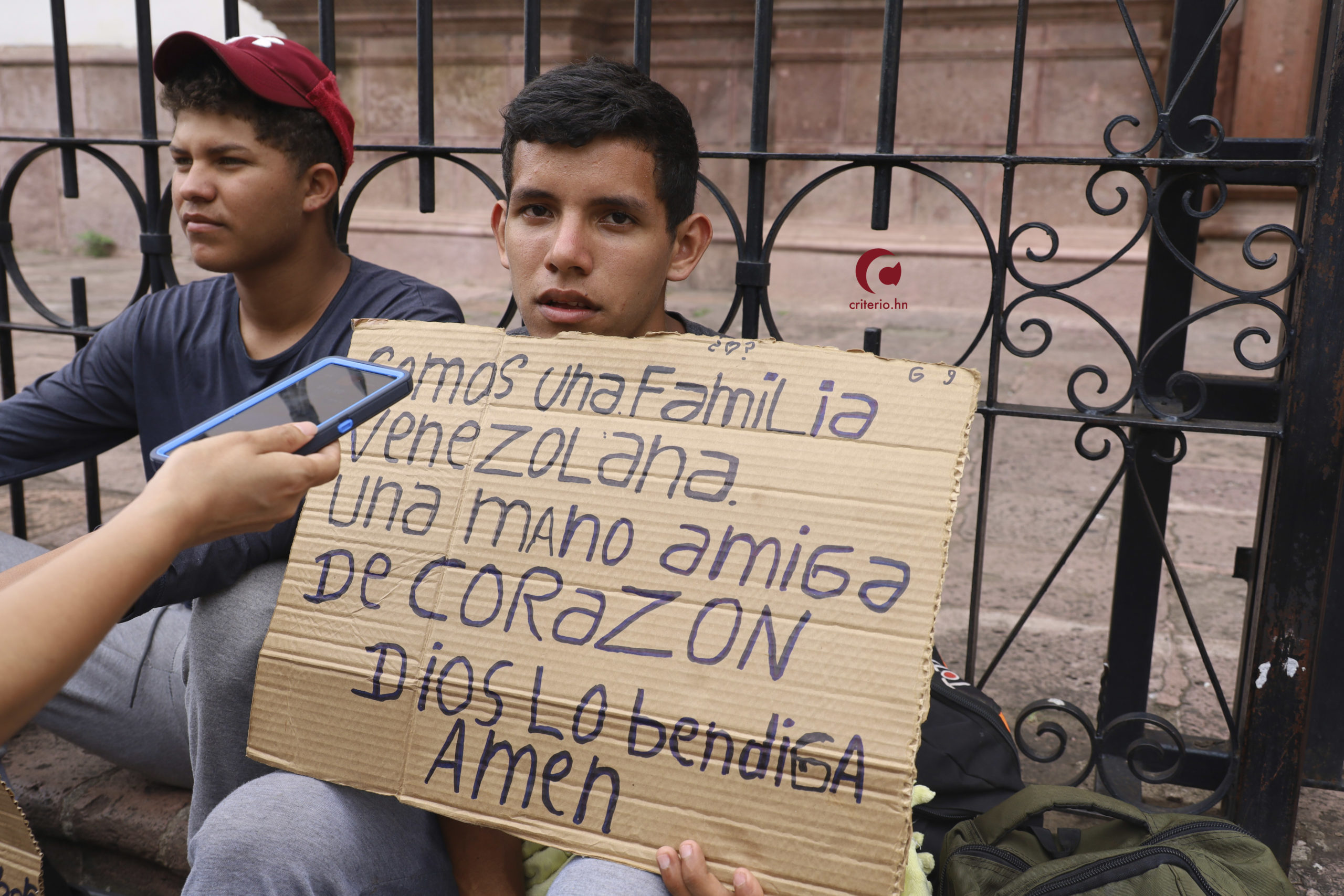 Tegucigalpa. – En las gradas de la Catedral de San Miguel Arcángel de Tegucigalpa, con un rótulo anunciando que provienen de Venezuela, una familia de ocho personas que migran hacia Estados Unidos, pedían asistencia, ayuda y alguna colaboración para continuar su camino.