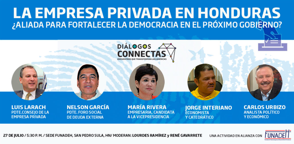 El encuentro en Honduras, titulado ¿Ayudará la empresa privada a fortalecer la democracia en el próximo gobierno de Honduras? se llevará a cabo a partir de las 5:30 de la tarde en la sede FUNADEH, Bulevar Las Torres, San Pedro Sula.