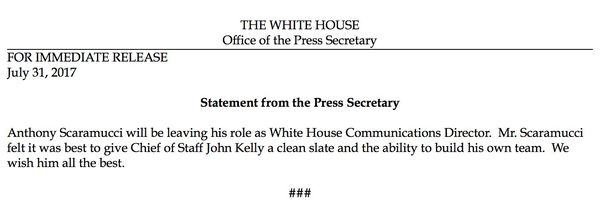 El comunicado de prensa de la Casa Blanca informó: «Anthony Scaramucci dejará su papel de director de Comunicaciones de la Casa Blanca. El Sr. Scaramucci creyó que lo mejor era darle al jefe de Gabinete John Kelly la posibilidad de comenzar de cero y armar su propio equipo. Le deseamos todo lo mejor».