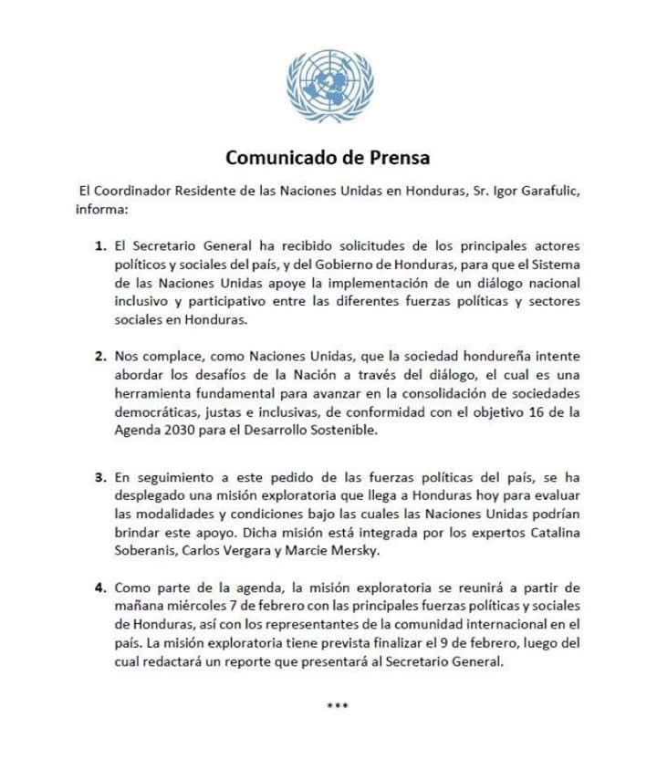 Tegucigalpa.- El secretario General de la Organización de Naciones Unidas (ONU), Antonio Guterres envió este día una misión exploradora a Honduras para analizar las condiciones de realizar un diálogo en el país centroamericano.