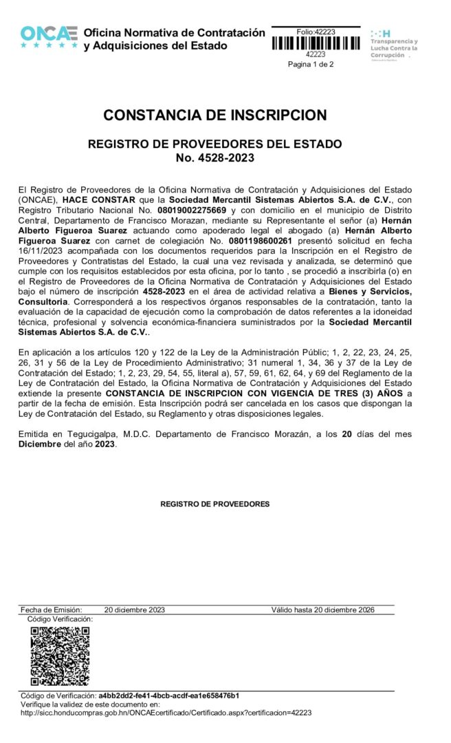 Mientras que, en un documento del 22 de junio de 2023, en el cual Gerardo Emilio Pacheco Chiuz, actuando como presidente del consejo de administración de la sociedad International Technology autorizó un poder general de administración a Emerson Haresh Pacheco Echeverri, ambos personajes aparecen como representantes de la empresa Sistemas Abiertos S.A. de C.V. en el documento emitido por la Oficina Normativa de Contrataciones del Estado (ONCAE).