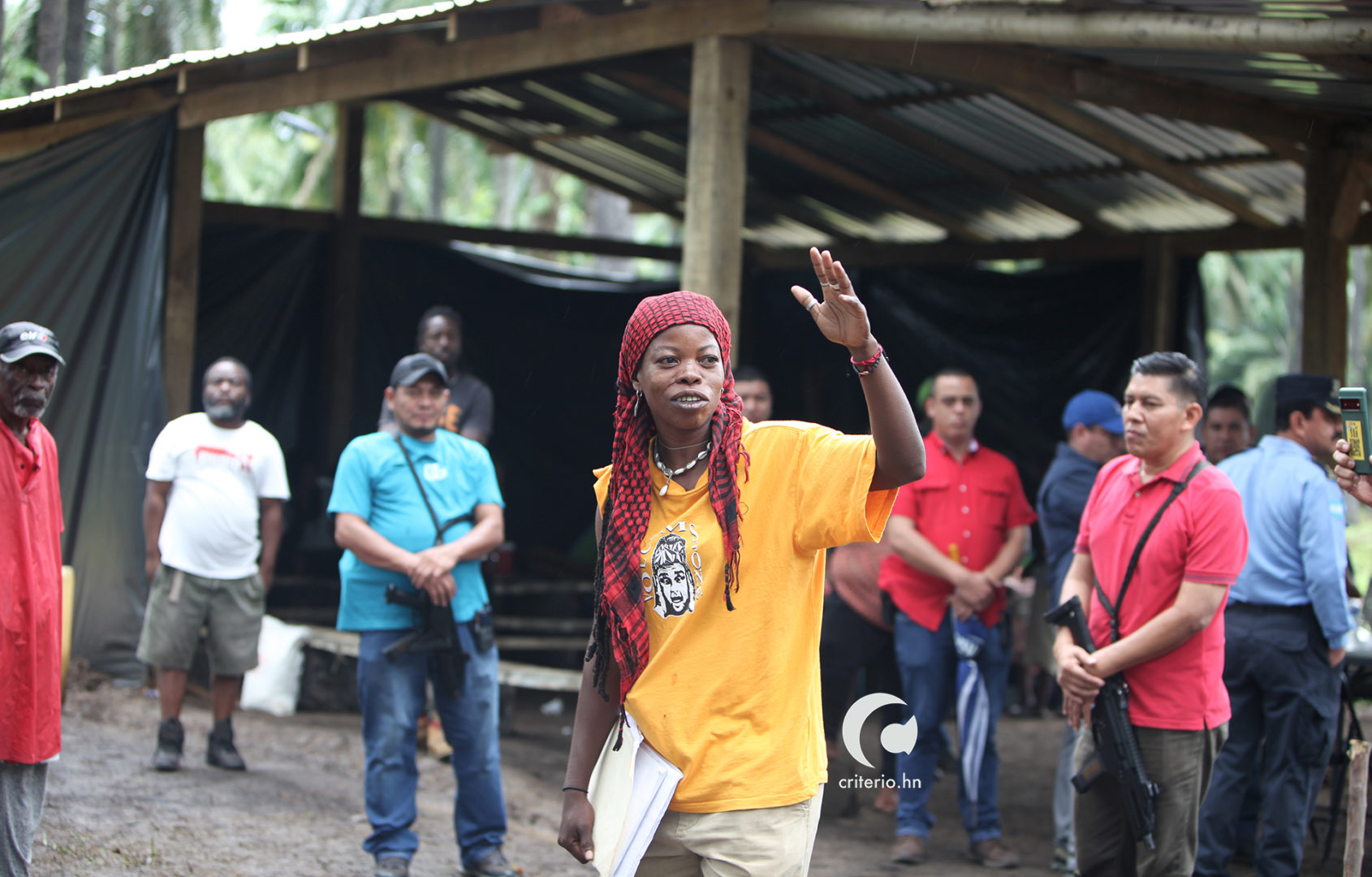 Pese a que la visita tenía por objetivo conocer la situación de amenaza constante bajo la que vive la población garífuna en el territorio recuperado, la presencia de hombres civiles armados generó temor y desconfianza. Fue Mabel Robledo quien tuvo que intervenir para solicitar que retiraran a las escoltas.