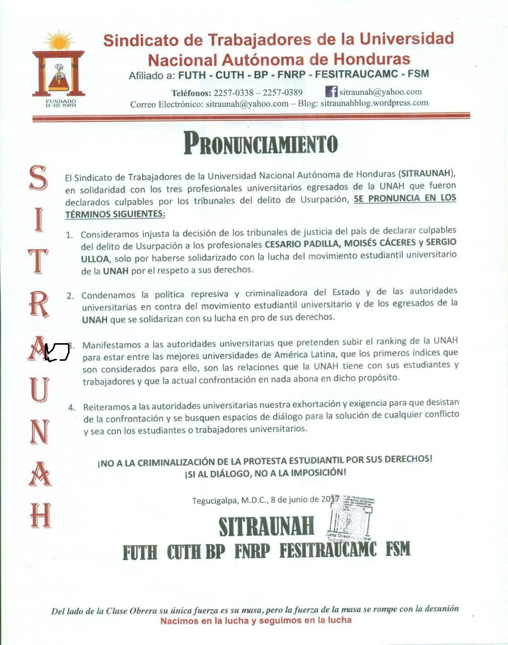 Tegucigalpa.- El Sindicato de Trabajadores de la Universidad Nacional Autónoma de Honduras (SITRAUNAH), se solidariza con los tres estudiantes que fueron declarados culpables por los tribunales del delito de Usurpación.