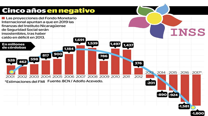 Acevedo advierte que la situación financiera del INSS se seguirá agravando en los próximos meses, tomando en cuenta que “en noviembre-diciembre los gastos operativos del INSS se incrementarán en más en 1,500 millones de córdobas adicionales, debido al pago del doble aguinaldo a los trabajadores del INSS (unos 260 millones de córdobas) y del decimotercer mes a los pensionados (unos 1,260 millones de córdobas), entonces quedará claro por qué el FMI estimó que el INSS finalizaría el año con un déficit de efectivo superior a los 1,800 millones de córdobas”.