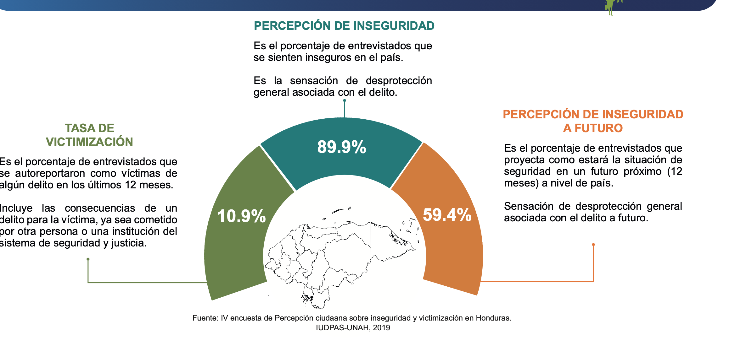 La investigación de IUDPAS establece que la percepción de inseguridad es del 89.9% que se sienten inseguros en el país, es decir, nueve de cada diez hondureños. Y el 10.9% de los entrevistados que se sienten víctimas de algún delito en los últimos 12 meses.
