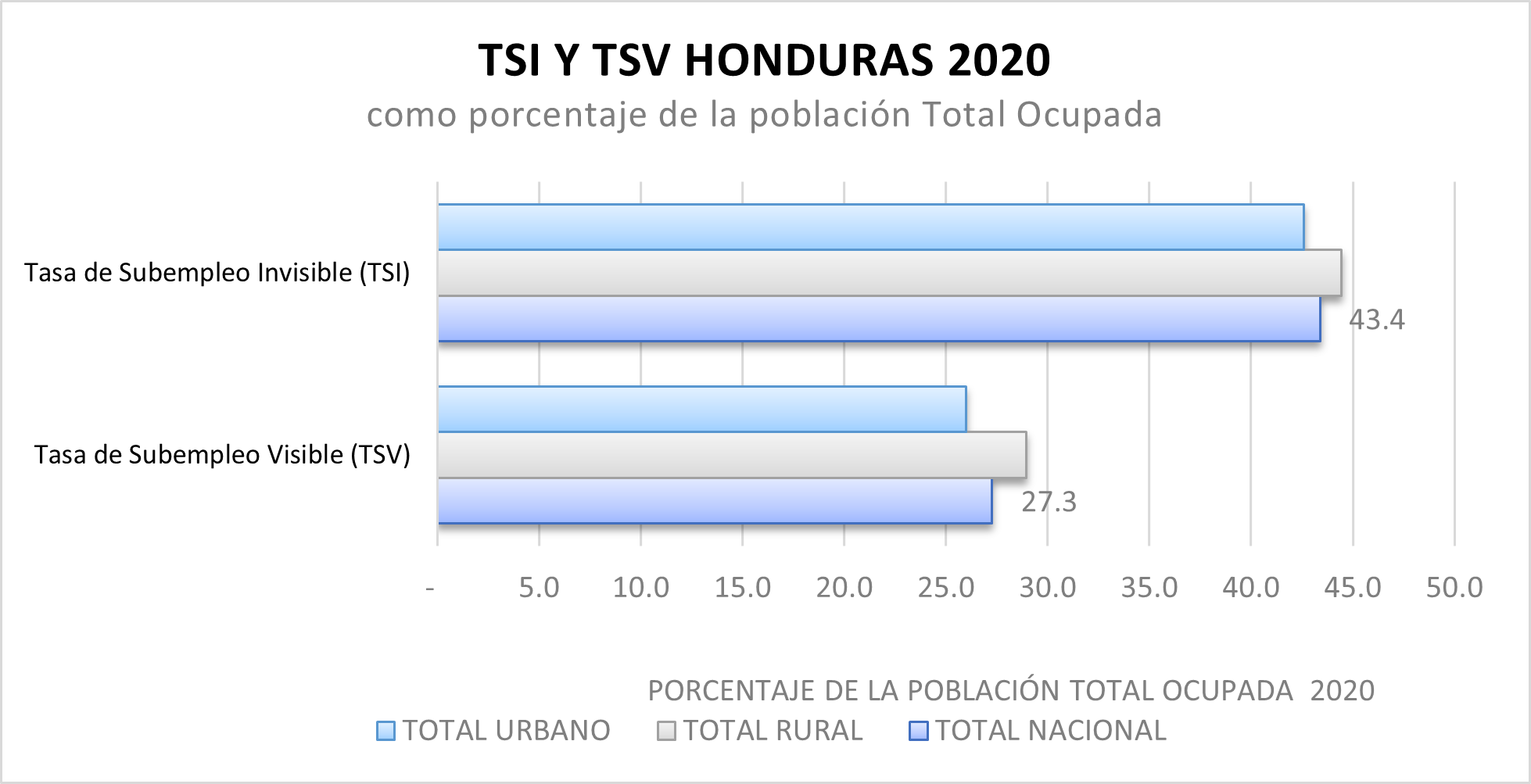 Aunado a esto, el Instituto Nacional de Estadística (INE) asevera que en 2020 en el país habitaban 996,554 personas con Subempleo Visible, es decir que estando ocupados, trabajan menos de 36 horas a la semana y desean trabajar más. En cambio las personas ocupadas bajo condiciones de Subempleo Invisible ascienden a 1,585,972. Este último se define como las personas que trabajan más de 36 horas y tuvieron ingresos inferiores a un salario mínimo, esto refleja una Tasa de Subempleo Invisible (TSI) nacional del 43.4%; la misma para el área rural, es del 44.4%.