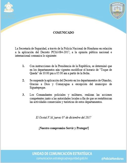 El pasado miércoles se determinó suspender el “toque de queda” en los departamentos de Choluteca, Valle, El Paraíso, Ocotepeque, Copán, Lempira, Intibucá y Santa Bárbara.