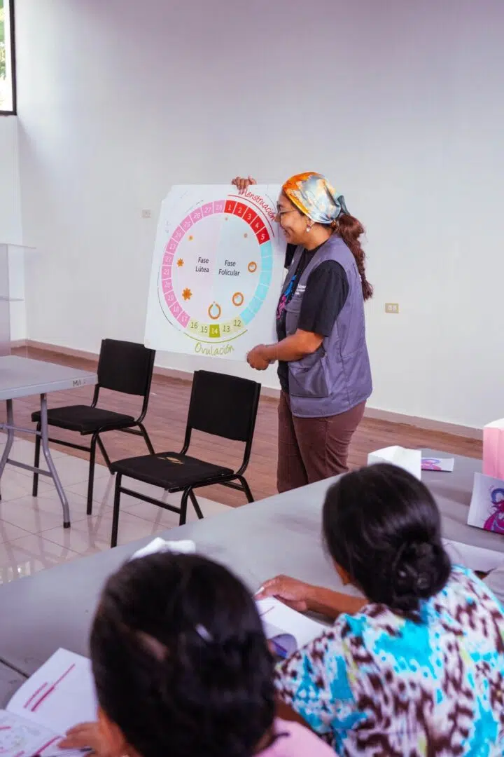 A través de recursos didácticos como una pancarta ilustrativa y modelos de crochet, explicó de forma clara el ciclo menstrual, y desmitificó creencias comunes relacionadas con el sangrado.