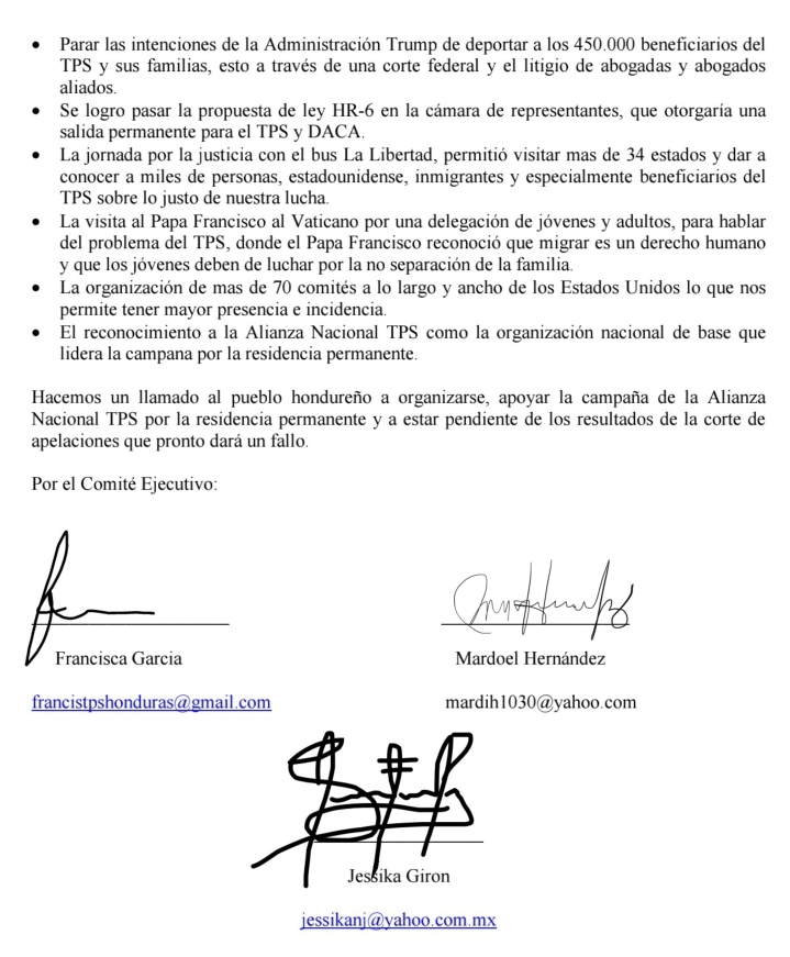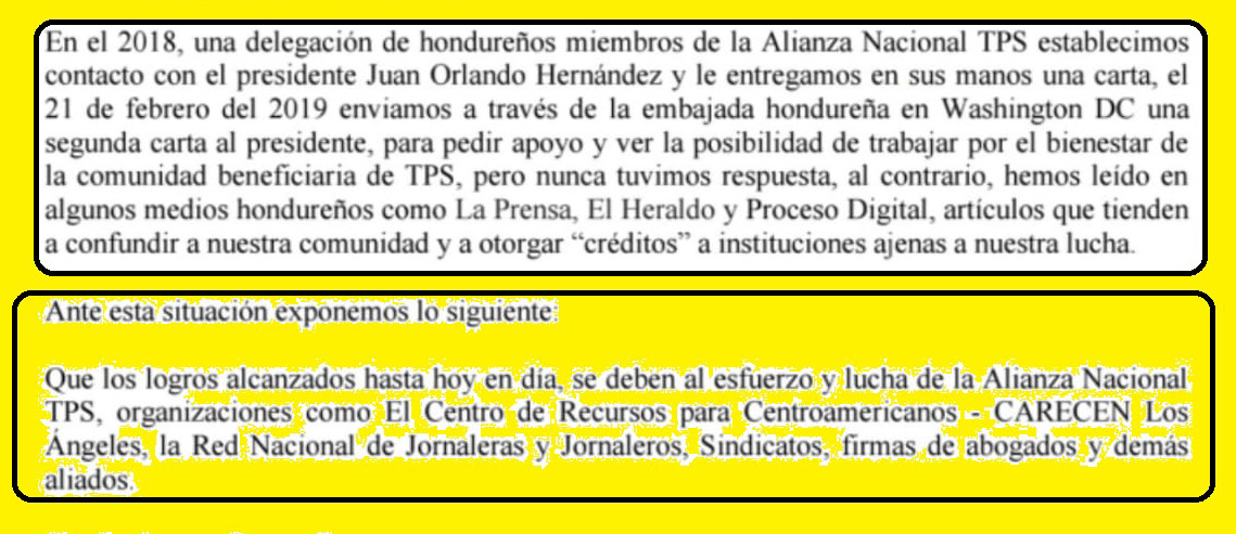 Sin embargo, la carta de la Alianza Nacional TPS dice que buscaron apoyo con el mandatario, pero nunca tuvieron respuesta y señalan a medios de comunicación corporativos afines al gobierno de mentir en torno al tema y otorgar créditos a instituciones ajenas a su lucha.