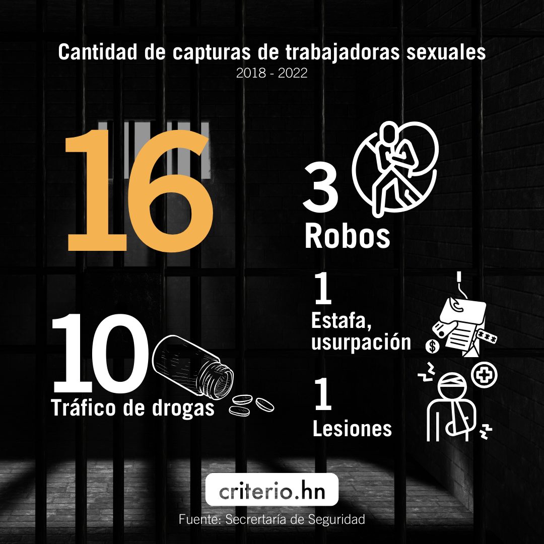 De acuerdo con la data de la Secretaría de Seguridad en Honduras, los departamentos de Francisco Morazán –al centro del país– y Cortés –al norte–, en los últimos años registraron 11 mujeres trabajadoras sexuales detenidas por delitos asociados a drogas.