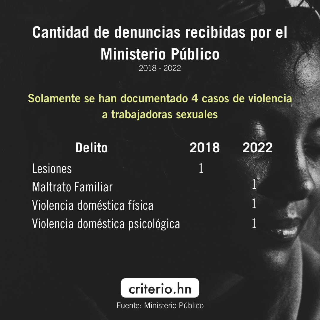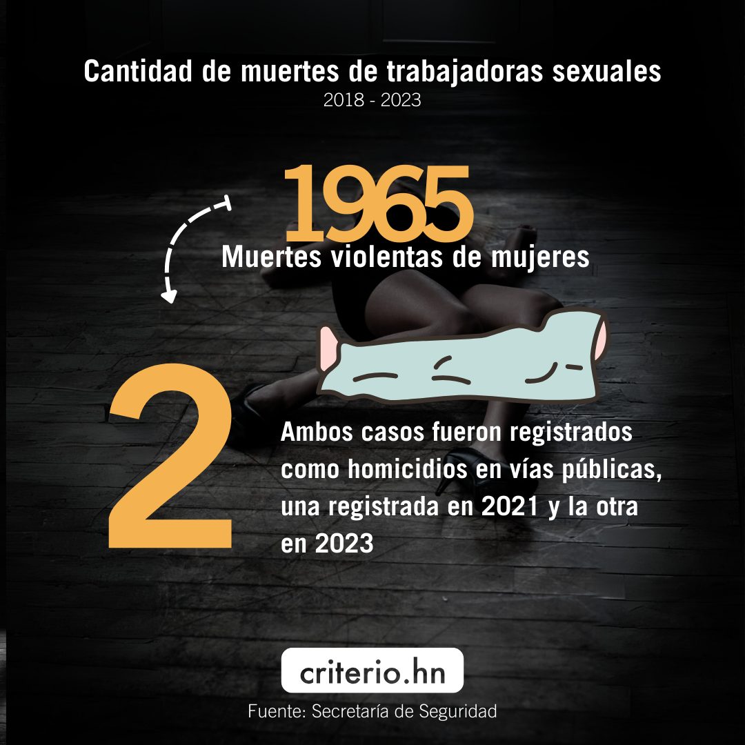 En Honduras, de acuerdo con la Secretaría de Seguridad, en los últimos cinco años, sólo dos mujeres trabajadoras sexuales han sido asesinadas, pero estas cifras son cuestionadas por especialistas en temas de seguridad que consideran que existe un subregistro debido al estigma y discriminación hacia esta población.
