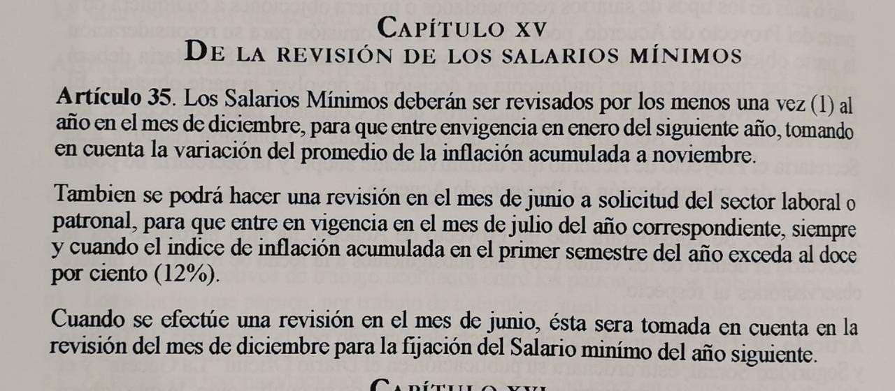 El artículo 35 de la normativa del salario mínimo indica que los salarios mínimos deberán ser revisados por lo menos una vez al año en el mes de diciembre, para que entre en vigencia en enero del siguiente año, tomando en cuenta la variación del promedio de inflación acumulada a noviembre.