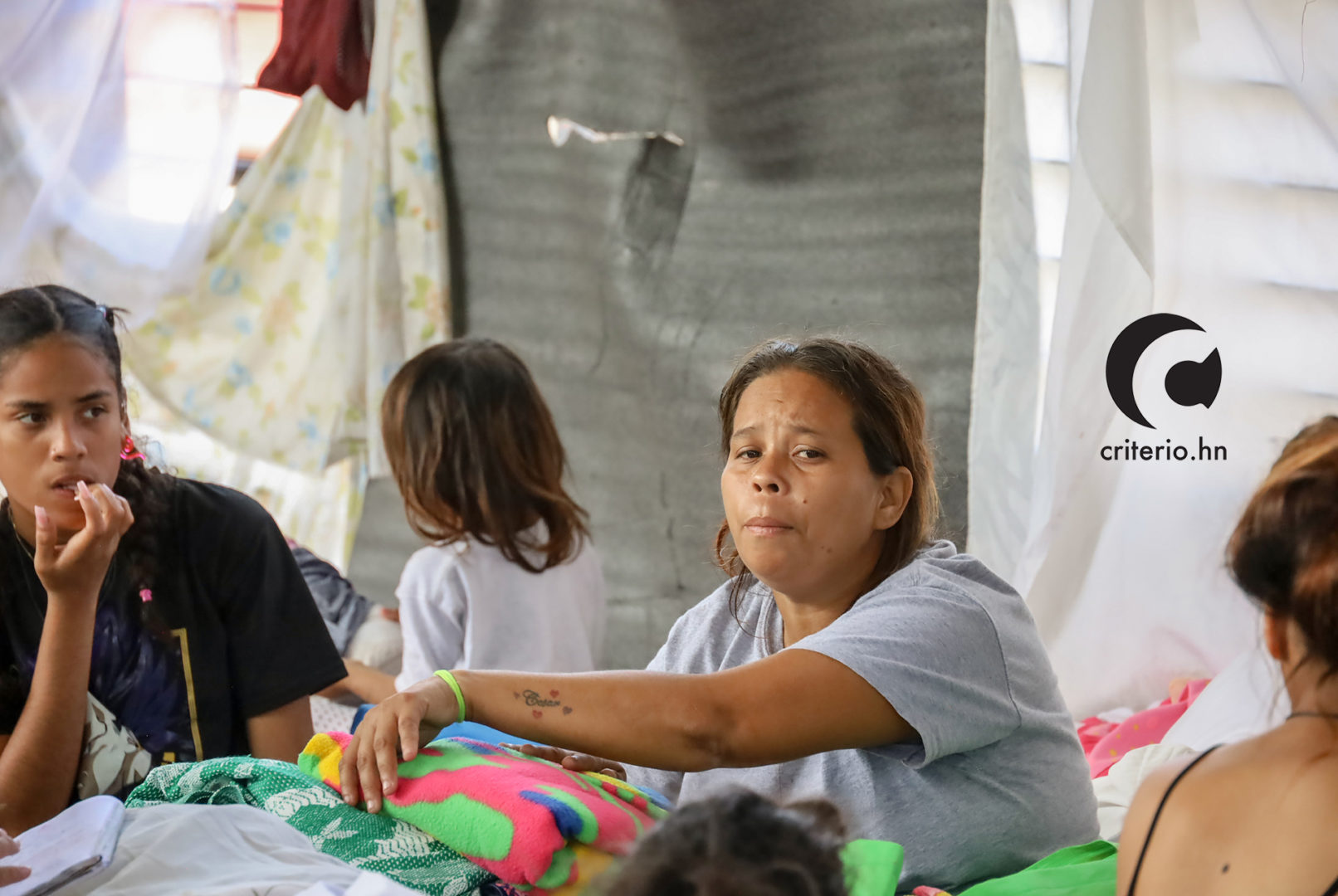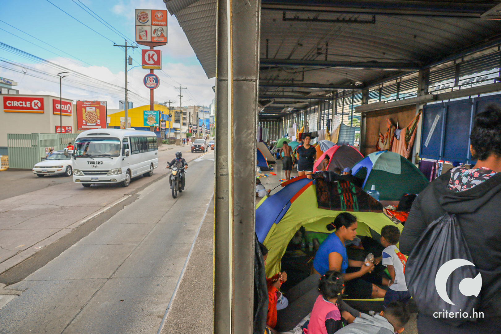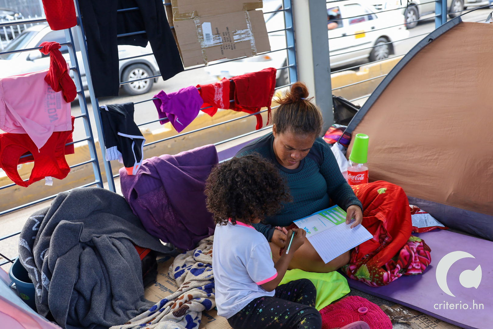 Franyeli García, contó a Criterio.hn que las noches en el trans 450 son frías, debido a la infraestructura de la estación, que consta de barrotes horizontales. Para palear el viento frio, han colgado plásticos, sabanas y algunos cartones. En el día, los barrotes funcionan de tendederos de ropa.
