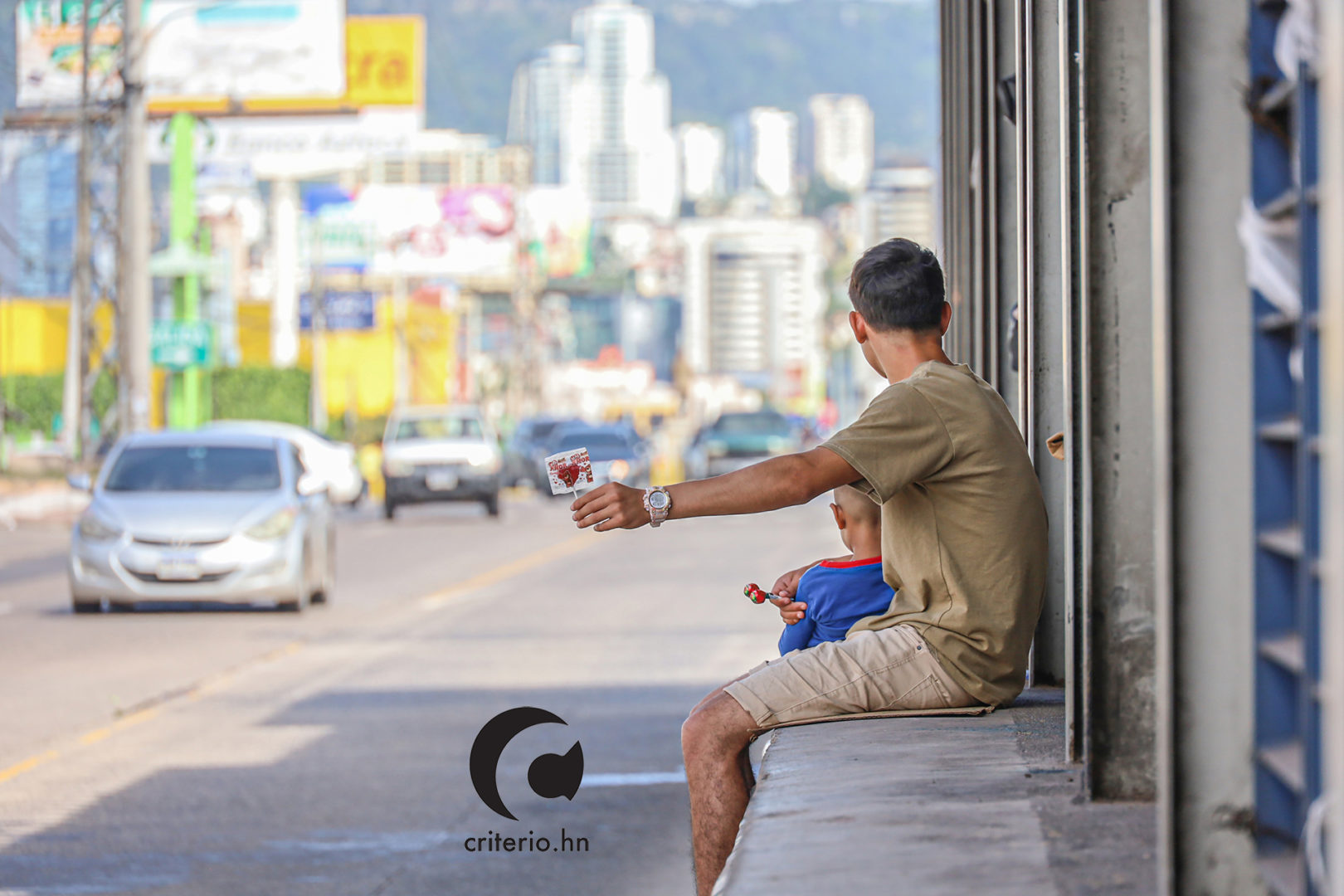 Mientras su esposo, sus primos y padrastro apelan a la bondad de los y las hondureñas que transitan en el concurrido bulevar, ella sentada en el suelo, le enseña a su pequeña hija de cinco años las vocales, los números, y con su mano guía a la pequeña niña de cabello rizado en la escritura de las letras.