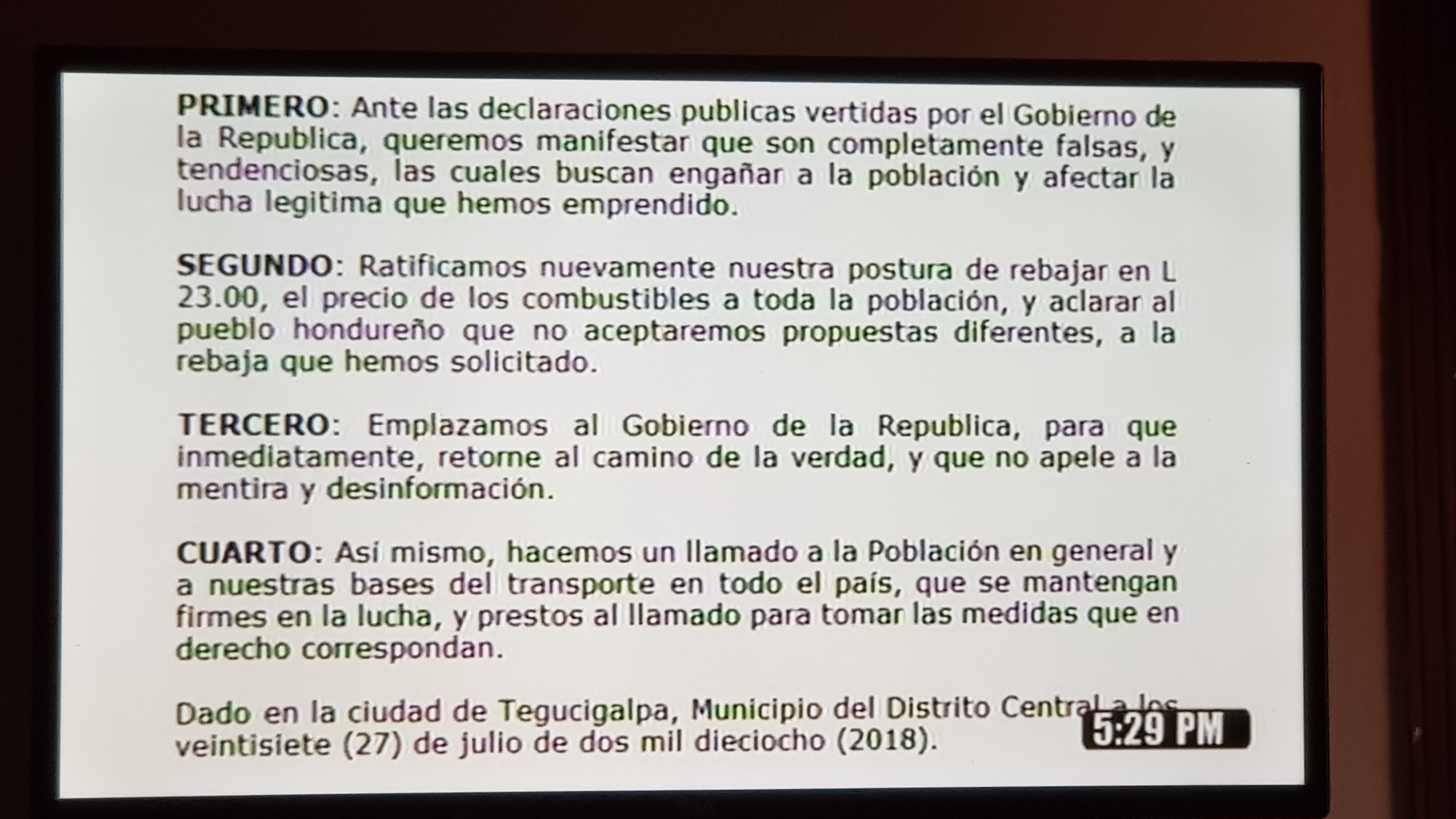 Tegucigalpa.- El Consejo Nacional del Transporte esta tarde de viernes emitió un comunicado donde dio a conocer que se mantienen firmes en su petición para que el gobierno rebaje 23 lempiras al precio del galón de combustibles.