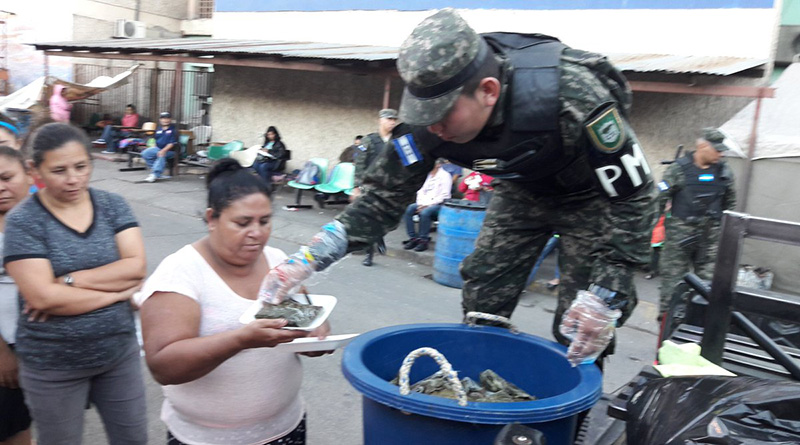Tegucigalpa.-Luego de haber sido acusados por organismos defensores de Derechos Humanos por crímenes contra hondureños que protestaban denunciando un fraude electoral, los elementos de la Policía Militar del Orden Público (PMOP) se han encargado en las últimas horas de repartir alimentos a los ciudadanos que viven en la indigencia.