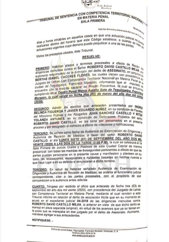 Tegucigalpa.- La Sala primera del Tribunal de Sentencia con competencia territorial nacional en materia penal, convoca para este lunes 7 de septiembre a audiencia de examinación de diligencias y revisión de medidas en el caso contra David Castillo.