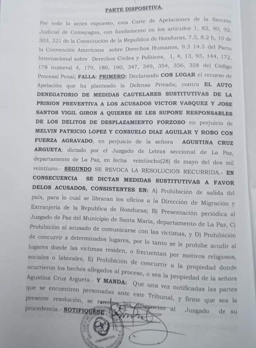 Finalmente, este jueves 14 de octubre, la Corte de Apelaciones dijo que el expediente debe volver al Juzgado de Letras de La Paz y retornar estableciendo que ya no tiene competencia sobre el caso, para que el Tribunal de Sentencia de Comayagua emita los oficios y ordene al centro penal que deje a José Santos Vijil Girón y Víctor Vásquez en libertad, pormenorizó a Criterio.hn el abogado Tabora.