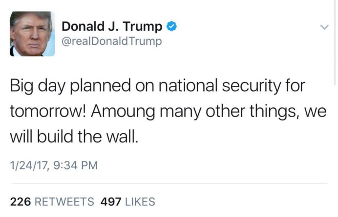 El presidente de Estados Unidos, Donald Trump, planea firmar este miércoles la orden ejecutiva para impulsar la construcción del prometido muro de separación con México con el fin de frenas la entrada irregular de inmigrantes, uno de los grandes y controvertidos compromisos de su campaña. La medida fue avanzada por la noche en varios medios locales y el propio Trump la mencionó después en su cuenta de Twitter: «Mañana está previsto que sea un gran día para la seguridad nacional. Entre otras cosas construiremos el muro!», dijo en su mensaje.