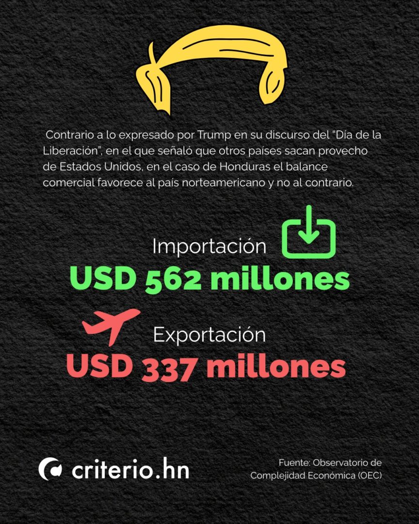 La OEC, en su página web, apuntó que en enero de 2025 la exportación de Honduras hacia Estados Unidos fue de USD 337 millones, mientras que Honduras importó USD 562 millones de Estados Unidos. Contrario a lo expresado por Trump en su discurso del “Día de la Liberación”, en el que señaló que otros países sacan provecho de Estados Unidos, en el caso de Honduras el balance comercial favorece al país norteamericano y no al contrario.