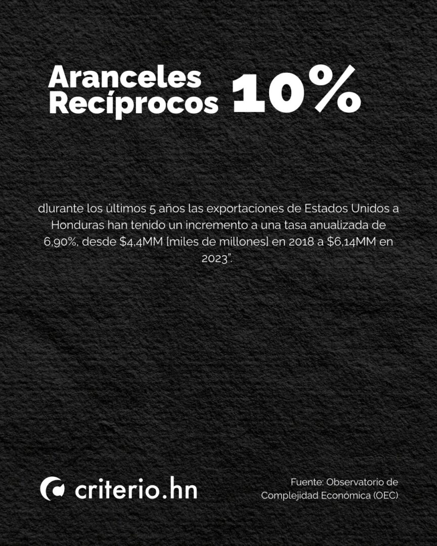 Con respecto al impacto que tendrá el arancel en la economía hondureña, señaló que, de acuerdo con datos del Banco Central, alrededor del 43% de las exportaciones de Honduras son hacia Estados Unidos, lo que le convierte en el principal socio comercial del país centroamericano. Le siguen los países centroamericanos con casi el 25%, Europa 20%, México 3% y China 1%.