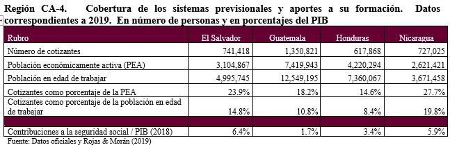 El primer problema que se observa en la región CA-4 es la muy limitada cobertura de los sistemas previsionales vigentes, y el, en gran parte, abandono de las autoridades públicas por mejorar estos, para que la totalidad de trabajadores del presente, tengan al menos una posibilidad concreta de disfrutar de un mecanismo garantizado de ingresos futuros para enfrentar la vida, cuando su capacidad de trabajo se haya visto mermada significativamente por la edad. Las estadísticas muestran que el país de la región que tiene una mayor cobertura de los trabajadores es Nicaragua, en donde el 27.7% de la población económicamente activa (PEA) cotiza a los fondos previsionales; seguido por El Salvador en donde la cobertura, tanto por los sistemas públicos como privados, alcanza el 23.9% de la PEA, mientras que Guatemala y Honduras, reportan muy bajos niveles, equivalentes al 18.2% y 14.6% de los trabajadores actuales.