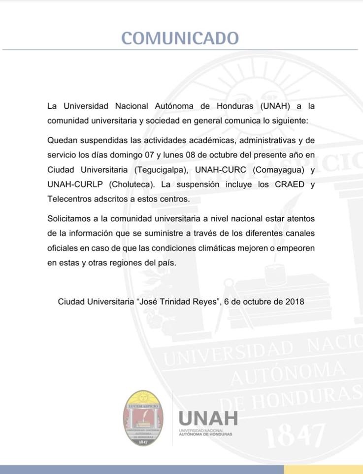 Mediante un comunicado, las autoridades de la UNAH piden a la comunidad universitaria que esté atenta a la información que se suministre por los diferentes canales oficiales en caso que las condiciones climáticas mejoren o empeoren.