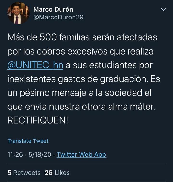 En el caso de los graduandos del mes de junio, “se nos está cobrando 14, 155 lempiras aumentando los costos en vez de rebajarlos ya que estamos en una pandemia y la graduación será virtual”, dijo Dubón.