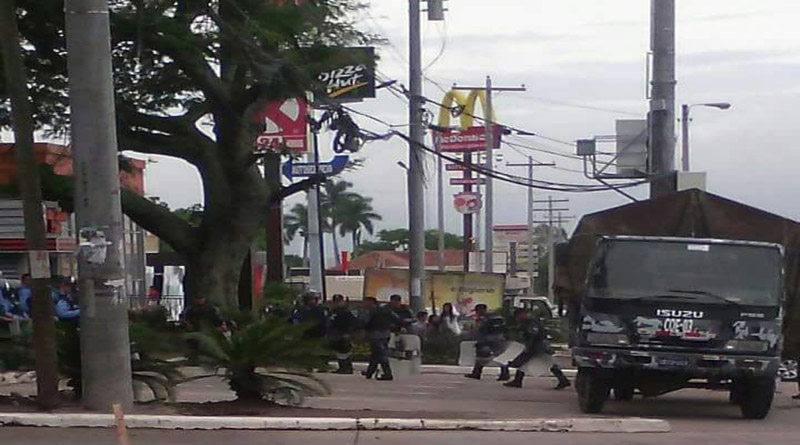 Mientras se desarrolla la movilización de los estudiantes, los alrededores de la UNAH se encuentran custodiados por elementos y vehículos de la Policía Cobras y Policía Nacional Preventiva.