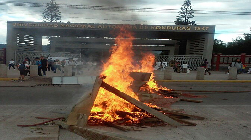 Tegucigalpa. Los estudiantes universitarios agrupados en el Movimiento Estudiantil Universitario (MEU), se tomaron este miércoles las calles frente a la ciudad universitaria para protestar en contra de la pretendida reelección del actual mandatario, Juan Hernández, que este día anunció su ilegal candidatura.