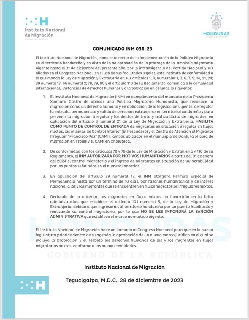 “Hacemos un llamado al Congreso Nacional para que en la nueva legislatura se priorice el tema migratorio y pueda seguir aprobando leyes y decretos que vayan en beneficio de los miles de migrantes que vayan en beneficio de las personas que transitan por el territorio hondureño”, expresó el funcionario casi al termino de 2023.