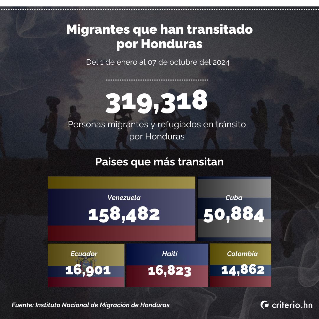 Desde el 1 de enero hasta el 7 de octubre de 2024, Honduras ha sido un punto de paso para 319,318 migrantes y refugiados en tránsito. De este total, destacan 158,482 venezolanos, 50,884 cubanos, 16,901 ecuatorianos, 16,823 haitianos y 14,862 colombianos.