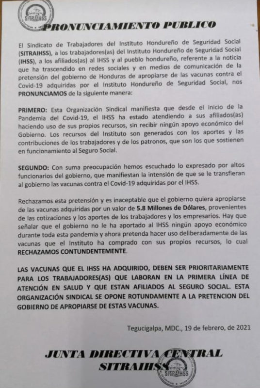 Hay que señalar que el gobierno no le ha aportado al IHSS ningún apoyo económico durante toda esta pandemia y ahora pretenda hacer uso deliberadamente de las vacunas que el instituto ha comprado con sus propios recursos, lo cual rechazamos contundentemente, reza el comunicado.