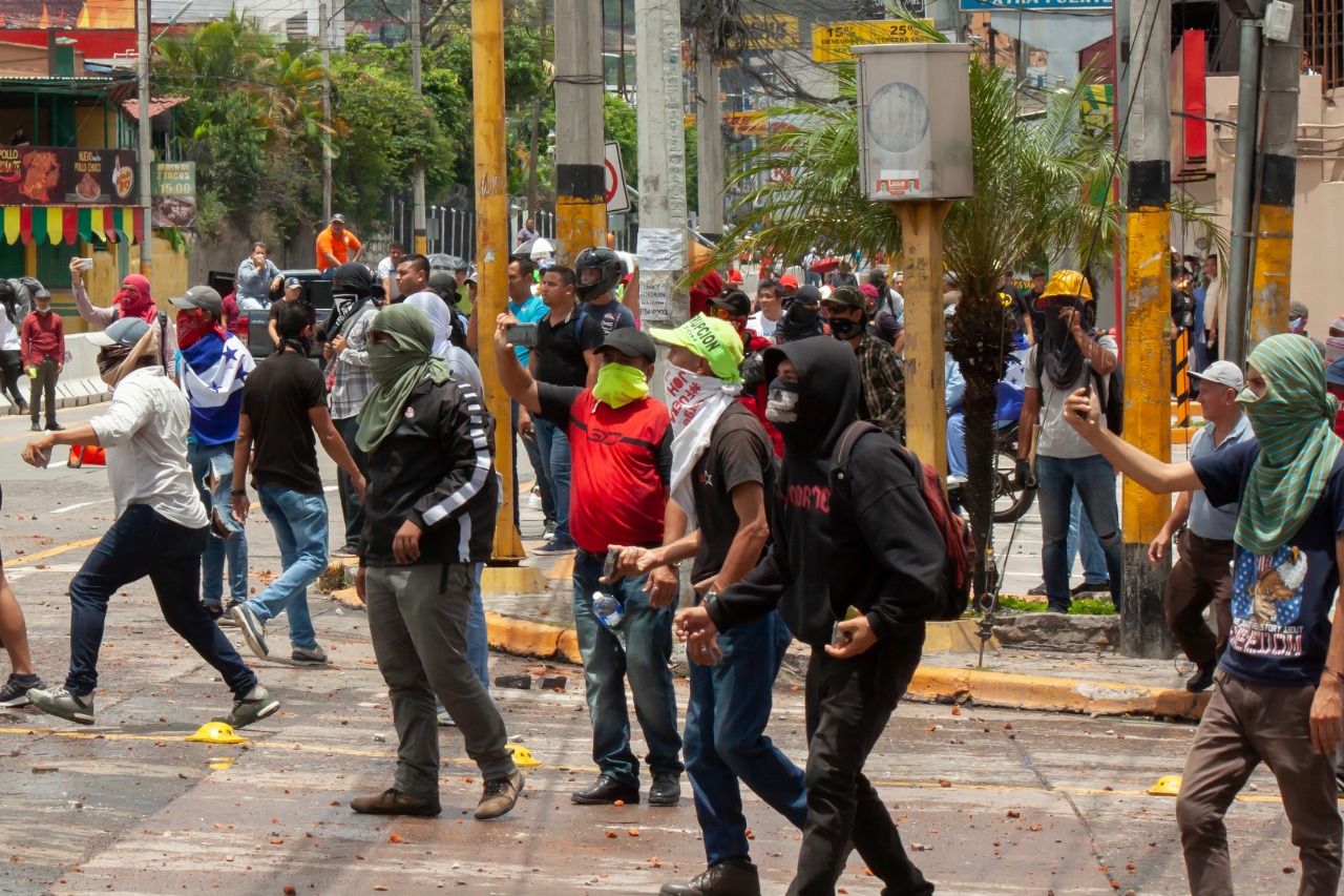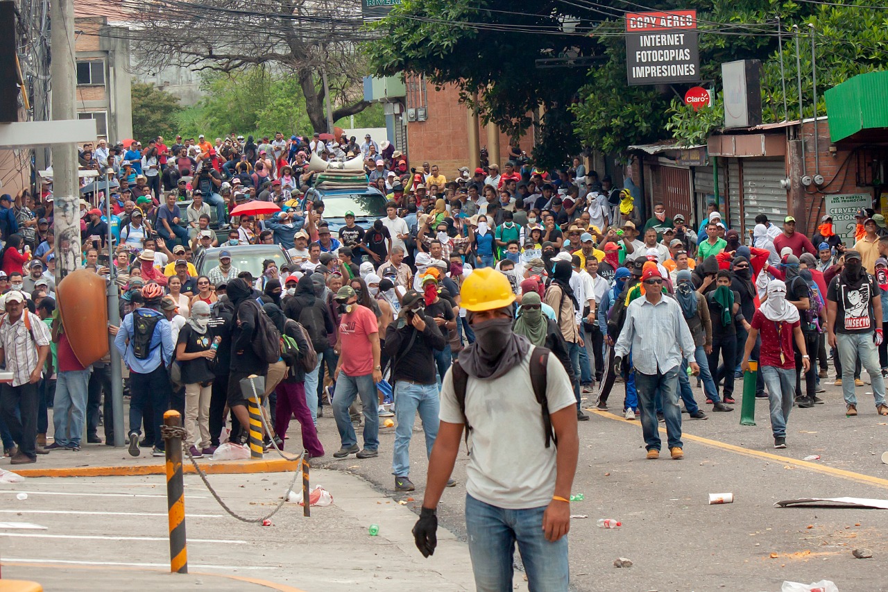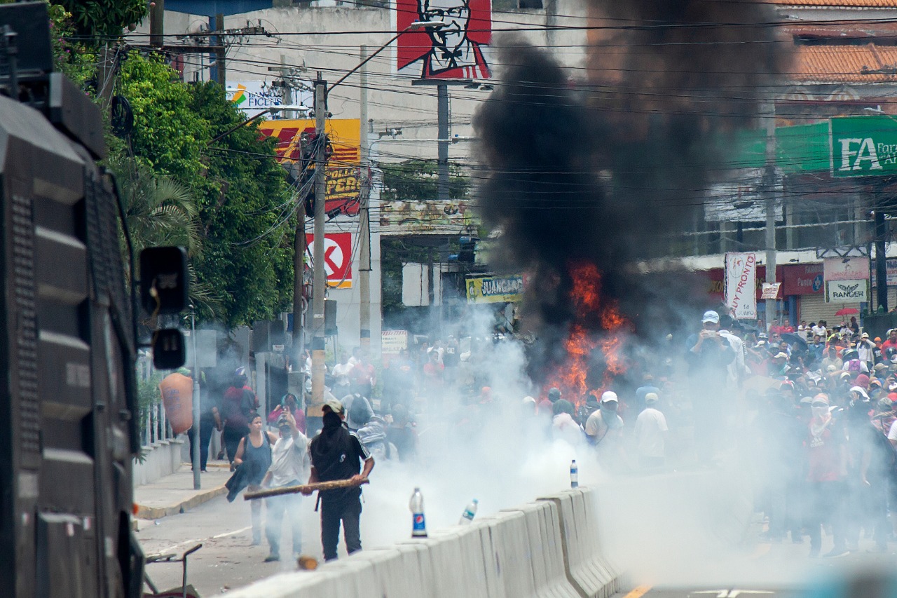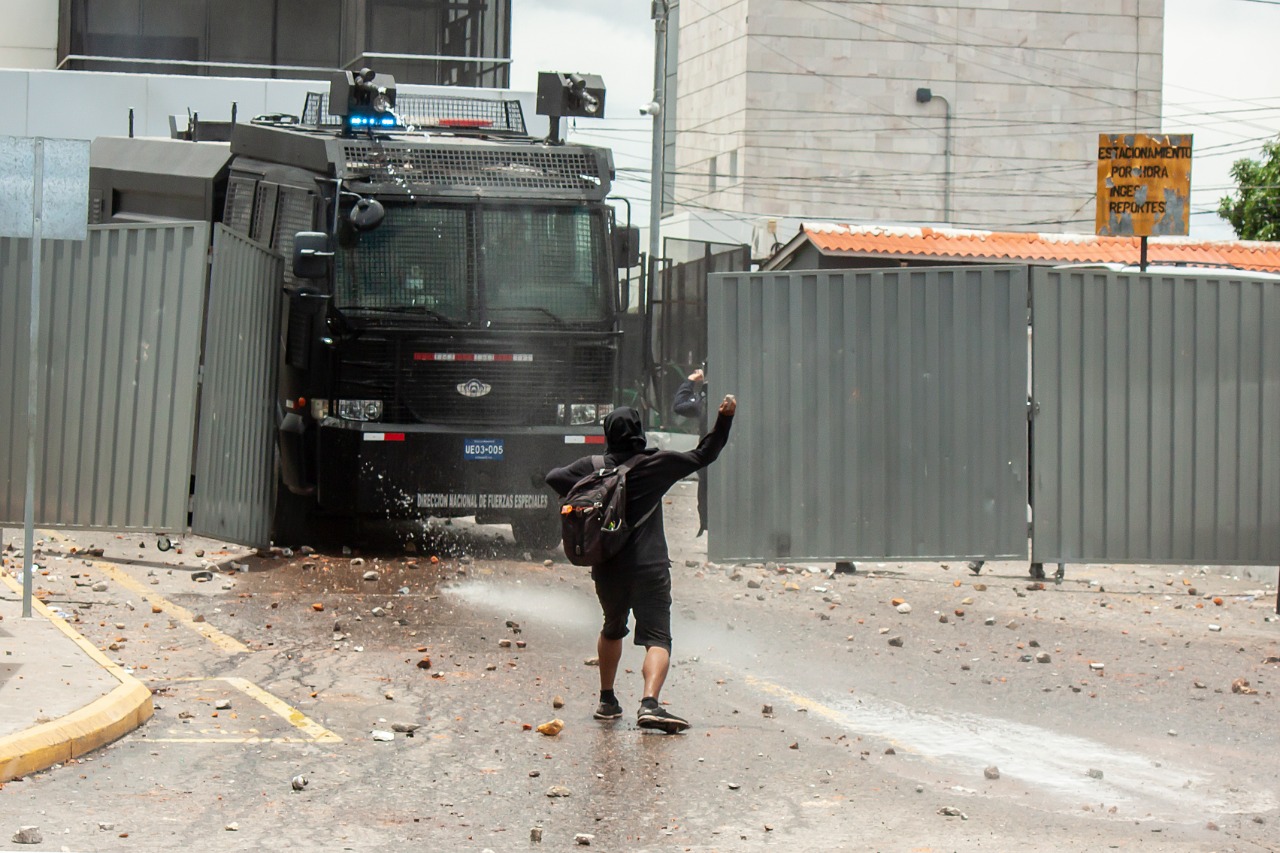 Los jóvenes hondureños no se amedrentan con la presencia de la policía y sus tanquetas de represión contra el pueblo que reclama sus derechos y la salida del gobernante acusado de estar involucrado en actividades de