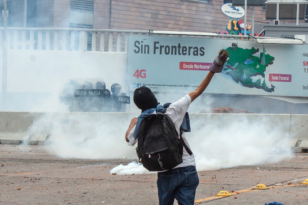 Mientras los policias disparan gases lacrimógenos y balas, los jóvenes se defienden con piedras