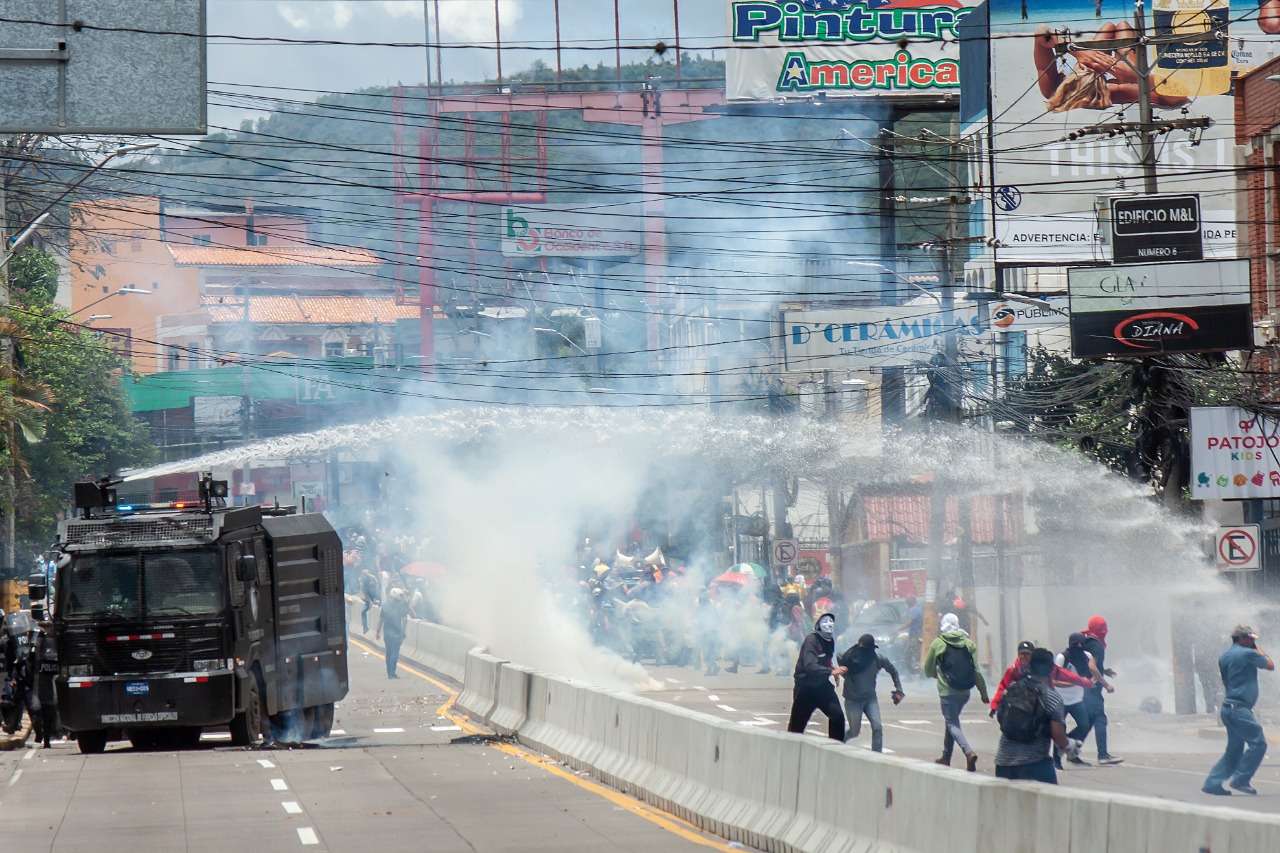 La policía en plena represión lanzando agua con químicos sobre los manifestantes cerca del aeropuerto de Tegucigalpa