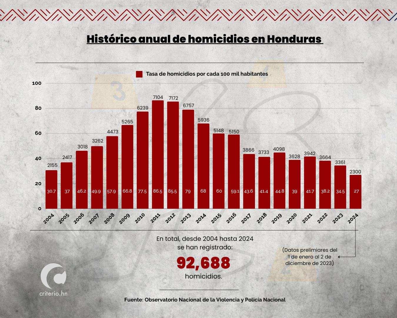 En el 2023, Honduras cerró con una tasa de 34.5 homicidios por cada 100 mil habitantes de acuerdo ONV-UNAH. Es decir, una disminución de 3.7 puntos en comparación con el 2022 que cerró en 38.2.