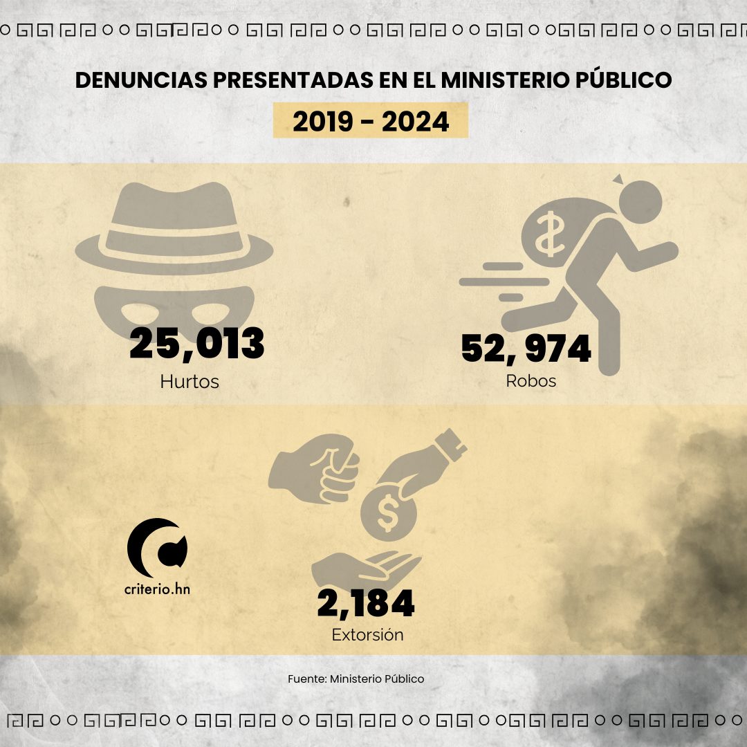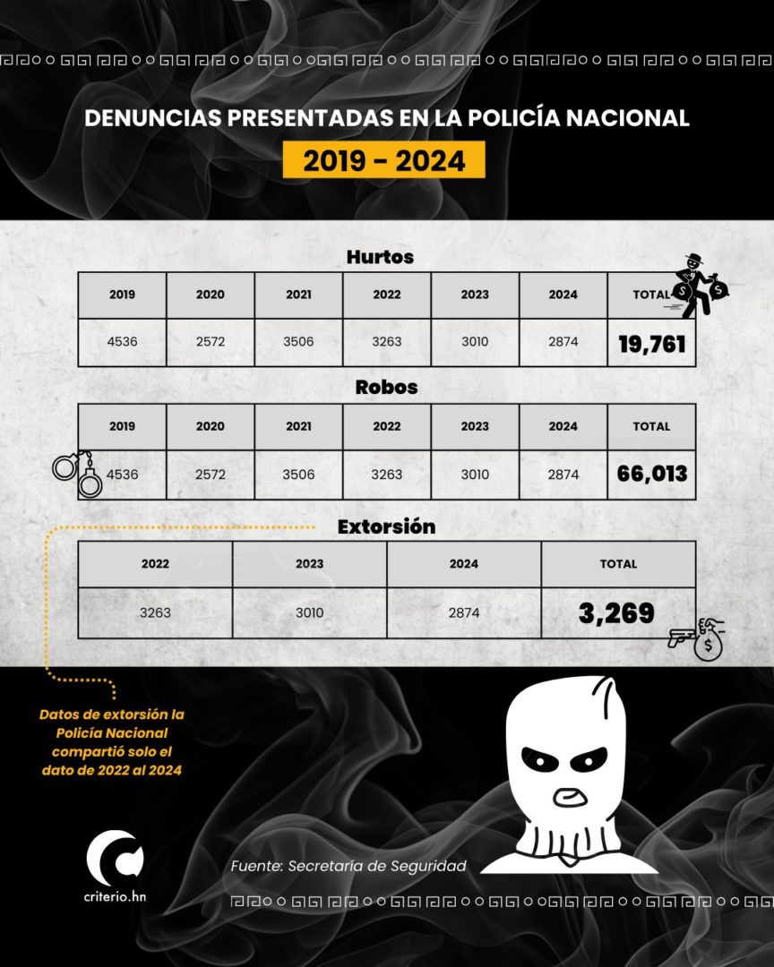 Respecto al delito de robo, la Policía Nacional registró 66,013 denuncias, siendo los departamentos con mayor incidencia Cortés con 19583 y Francisco Morazán con 17234 denuncias en los últimos cinco años. Además, por el delito de extorsión, la Secretaría de Seguridad detalló las denuncias recibidos desde el 2022 al 2024, siendo estas 3269.