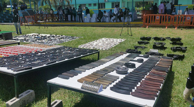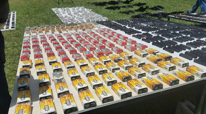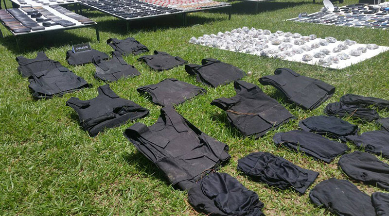 El gobernando hizo alarde de la supuesta eficiencia de la policía este miércoles en el centro penal de la ciudad de San Pedro, al presentar ante los medios de comunicación un arsenal, que incluye granadas, fusiles de asalto, subametralladoras, gruesos fajos de billetes, chalecos antibales, pasamontañas, droga, entre otras cosas, que supuestamente tenían en su poder los miembros de maras que fueron trasladados en marzo pasado a las cáceles de máxima seguridad de “El Pozo”, “La Tolva” y El Porvenir.