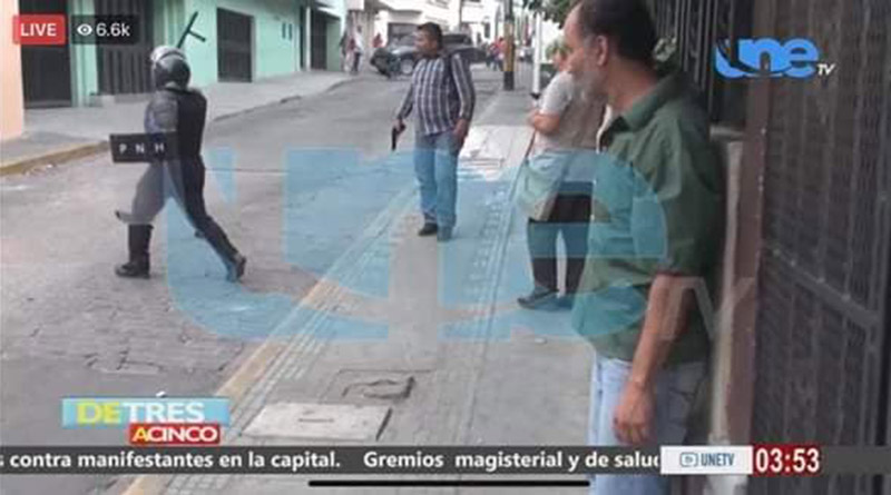 Tegucigalpa.-Un vídeo captado por las cámaras de UneTV muestra a dos hombres armados en medio de policías durante la represión ejercida este lunes en Tegucigalpa por las fuerzas de seguridad del Estado contra los manifestantes que protestaban contra la recién aprobada Ley de Reestructuración y Fortalecimiento del Sistema de Salud y Educación.