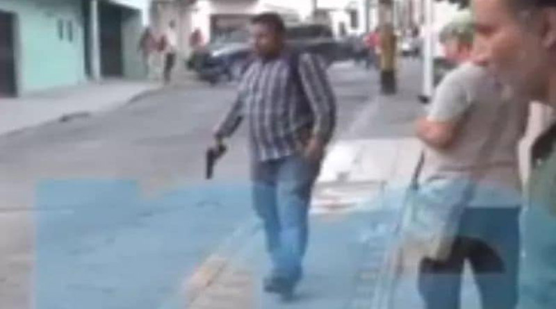 El vídeo muestra cuando un hombre de camisa manga larga, a rayas, extiende una pistola y dispara contra la multitud. Las imágenes, retratan además a otro hombre con una camisa ajustada al cuerpo y con un suéter colocado en la cintura, con una pistola en la mano.