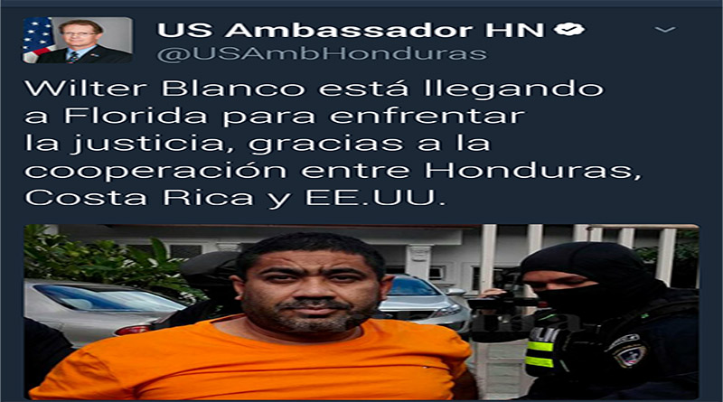 El diplomático estadounidense escribió en su cuenta de Twitter: «Wilter Blanco está llegando a Florida para enfrentar la justicia, gracias a la cooperación entre Honduras, Costa Rica y EE.UU.».